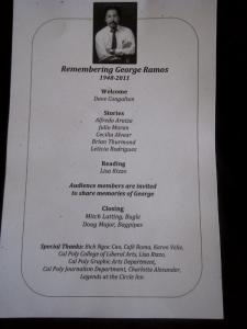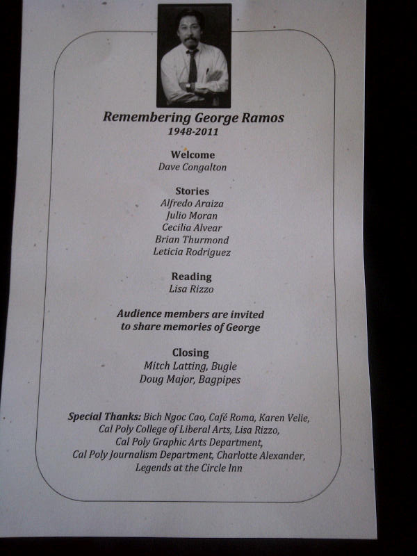 And we laughed when his student at Cal Poly, Leticia Rodriguez told the story of how George helped himself to her bag of Doritos. And on another occasion had her come to his “office” at Legends to review a story and then bought her a beer.